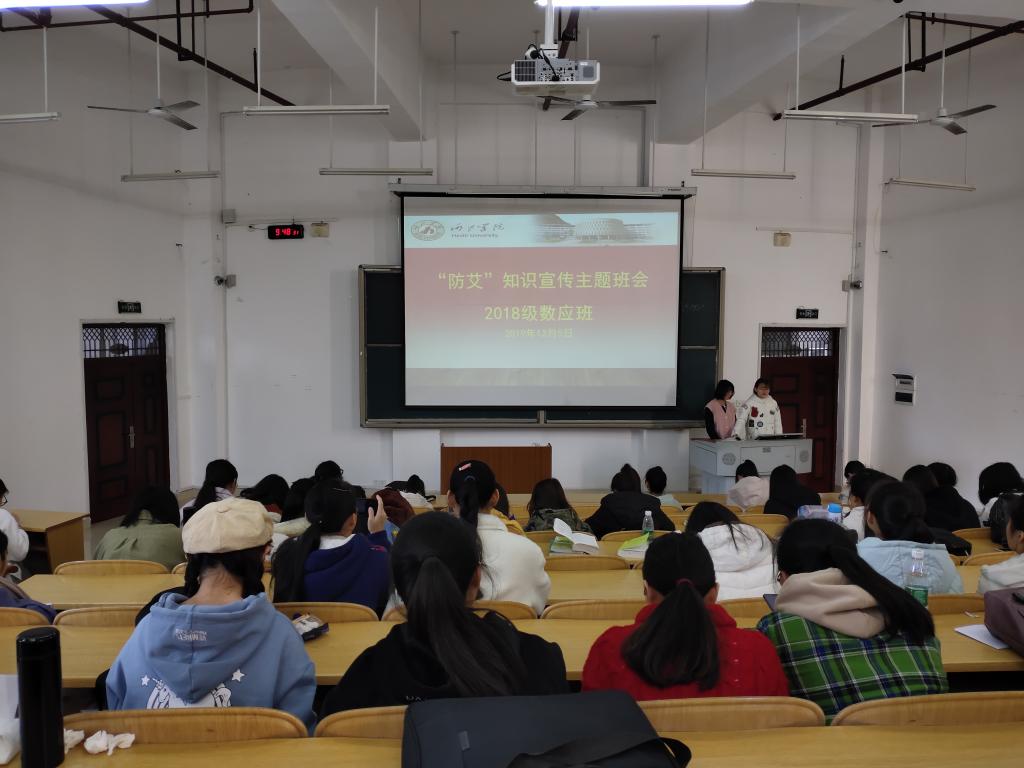 艾滋病已经成为全世界共同预防的疾病,艾滋病是一个严重的、复杂的公共卫生和社会问题。艾滋病正从高危人群逐步向普通人群扩散。12月5日,18数应班在西区格致楼-102教室开展了“防艾”知识宣传主题班会。本次班会由18数应1班班长余美媛主持,18数应2班班长黄晓玲主讲。18数应1、2班全体同学参加本次班会。