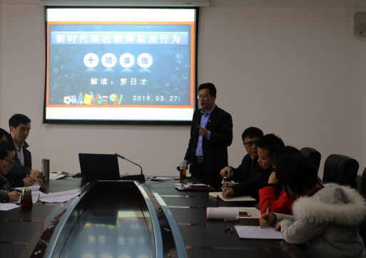 2019年3月27日下午,数学与统计学院在西区格致楼823召开师德师风建设专题会议,会议由数统学院院长罗日才主持,数统学院全体教职工参加会议。