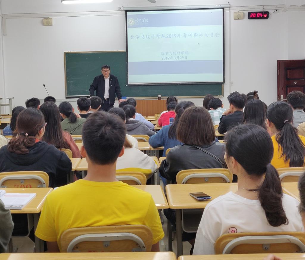 为增进同学们对考研的了解,帮助同学们树立考研目标,为准备考研的同学指明方向。数学与统计学院于2019年3月29日晚在西区格致楼708室召开2019年考研指导会。动员会由数学与统计学院副院长韦玉程主持,学院2016级同学参加本次指导会。