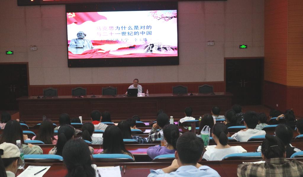 李玉雄教授从“马克思主义为什么是对的”、“如何信仰马克思主义”和“我们应该如何看待21世纪的世界与中国”三个方面展开论述,他指出,对青年而言,马克思主义是构建理论自觉、完善思维方法、引领时代发展的不二法门。学习马克思主义,就掌握了观察世界、分析问题的有力哲学武器;信仰马克思主义,就有了推动个体成长、民族进步、社会发展、人类和谐的伟大力量。回顾历史,马克思主义引领中华民族从水深火热中走上了独立富强民主文明之路。21世纪中国的离不开马克思主义的指引。讲座最后,李玉雄教授向同学们推荐了《马克思为什么是对的》与《如何让世界读懂中国》两本著作,希望大学生们要坚定理想信念,牢固树立“四个意识”,不断增强“四个自信”,努力学习专业知识,为两个一百年伟大目标做出应有贡献。