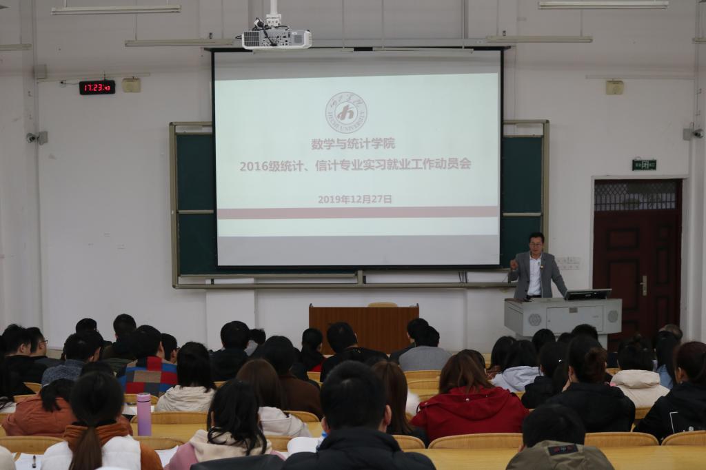数学与统计学院于12月27日下午在格致楼负102教室召开2020届毕业生实习暨就业动员大会,解读毕业生自主实习管理办法、安排部署毕业实习就业相关工作、开展实习期间安全教育。学院党总支书记黄星寿、院长罗日才、党总支副书记张明进、辅导员罗超、教学秘书银冬冬、科研秘书王新奇、学院2020届各专业实习就业指导老师以及2020届毕业生参加会议,会议由党总支副书记张明进主持。