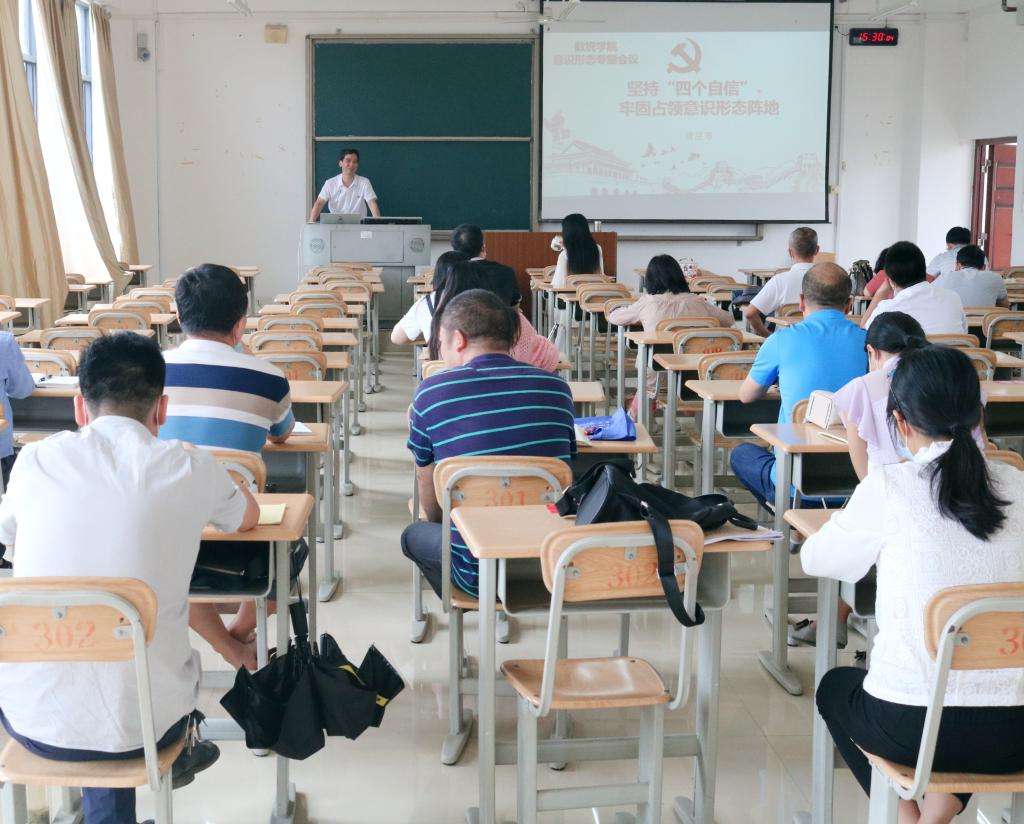 5月27日,数学与统计学院于西区格致楼301教室召开题为“坚持‘四个自信’牢固占领意识形态阵地”的意识形态工作专题会议。会议由学院党总支部书记黄星寿主持,全体教职工参加会议。