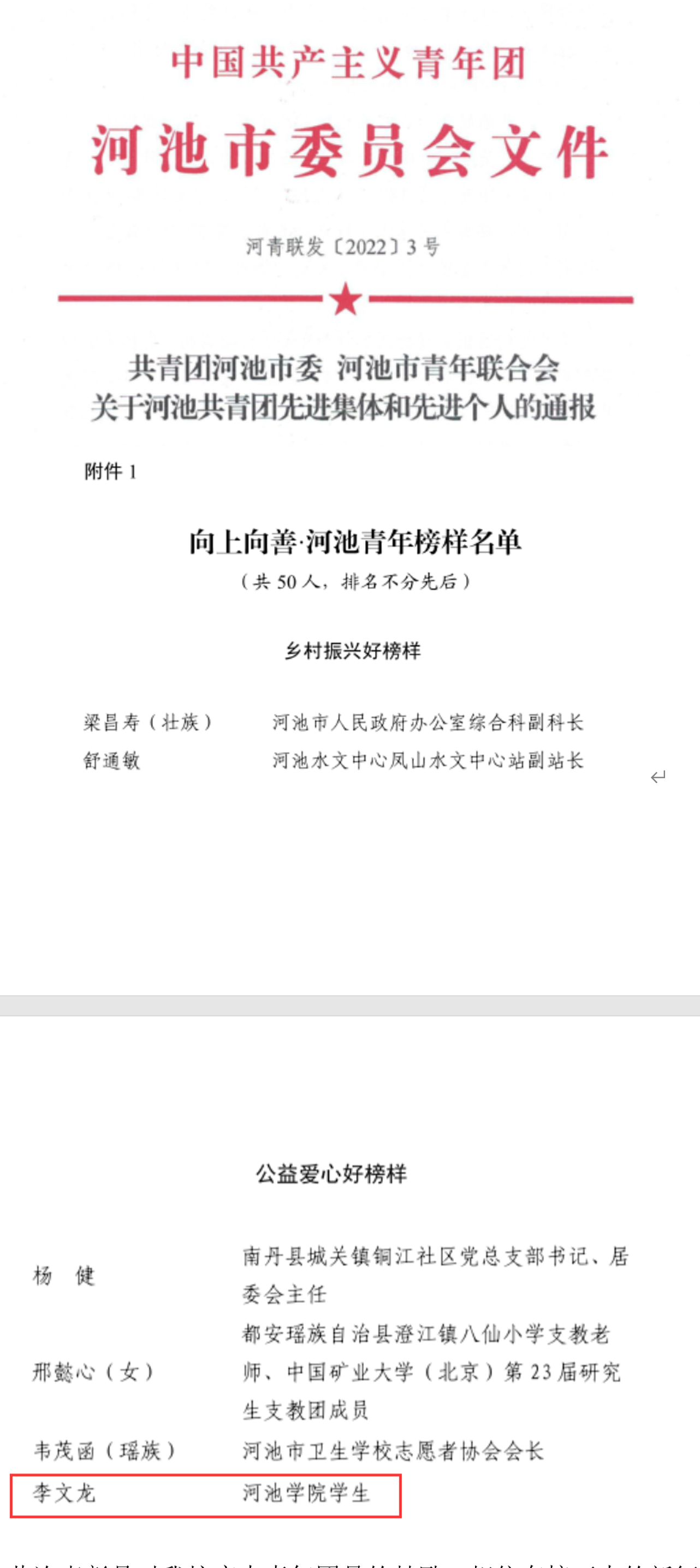 近日,河青联发[2022]3号文根据共青团河池市委下发的 《共青团河池市委河池市青年联合会关于河池共青团先进集体和先进个人的通报》(河青联发[2022]3号)文件获悉,我校必赢3003no1线路检测中心2019级经济统计专业李文龙同学荣获“向上向善河池青年榜样”中公益爱心好榜样荣誉称号。