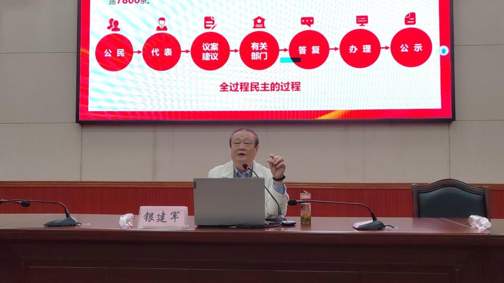 银建军教授从促进人的现代化、实现全体人民共同富裕、协调物质文明和精神文明、促进人与自然和谐共生、和平发展道路等五个方面深入阐述了以中国式现代化全面推进中华民族伟大复兴的重要意义,并勉励同学们在今后的学习和生活中要不断提高自己的政治理论水平,学好科学文化知识,坚定守正,锐意创新,为实现中华民族伟大复兴而不懈奋斗。