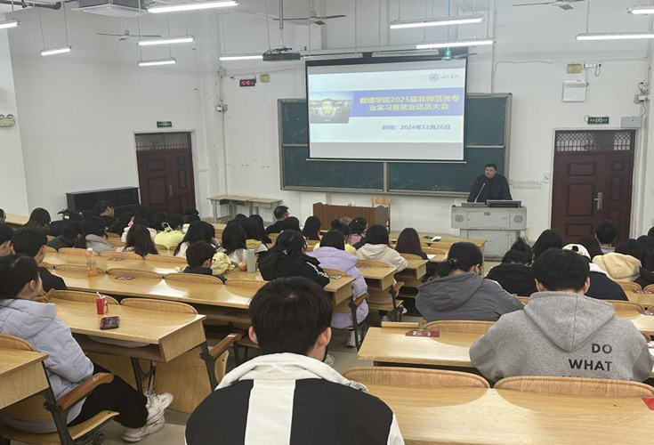 为全力推进2025届毕业生的实习与就业工作,引导毕业生树立正确就业观念,推进学院毕业生就业工作,12月26日下午,必赢3003no1线路检测中心在格致楼负102教室召开2025届非师范类专业实习暨就业动员大会。会议由学院辅导员田茂才老师主持,学院党委副书记石宁、统计系主任陆尚辉、信计系副主任磨峰、全体辅导员以及毕业班班主任出席会议。