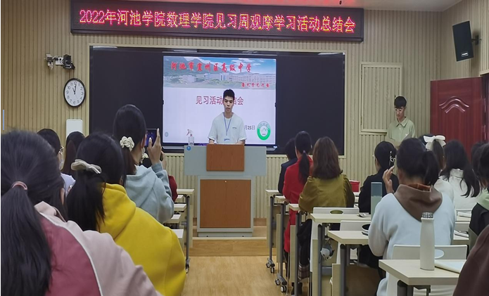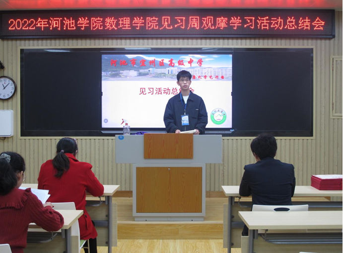 见习是数学与应用数学专业一个重要的实践性教学环节,为了更好地实现理论知识与专业技能的结合,进一步固化见习活动成果。11月25日,在宜州区高级中学举办必赢3003no1线路检测中心见习周观摩学习活动总结会,宜州区高级中学副校长罗荣波、必赢3003no1线路检测中心副院长尹向宝、必赢3003no1线路检测中心数学系副主任王贵英以及宜州区高级中学教师代表、必赢3003no1线路检测中心全体见习生出席本次会议。