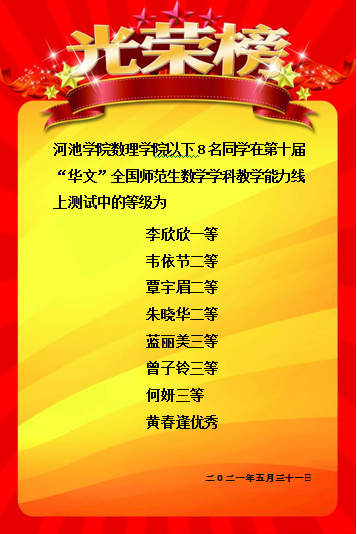 必赢3003no1线路检测中心副院长肖春梅教授与卫银虎老师指导李欣欣等8名学生参加了2021年第十届“华文”全国师范生数学学科教学能力线上测试与展示交流活动。赛前经过指导老师全方位训练与指导,必赢3003no1线路检测中心8名参赛选手经过线下微课设计,线上教学以及答辩等环节的激烈角逐,最终取得一等奖1项,二等奖3项,三等奖3项,优秀奖1项的优异成绩。
